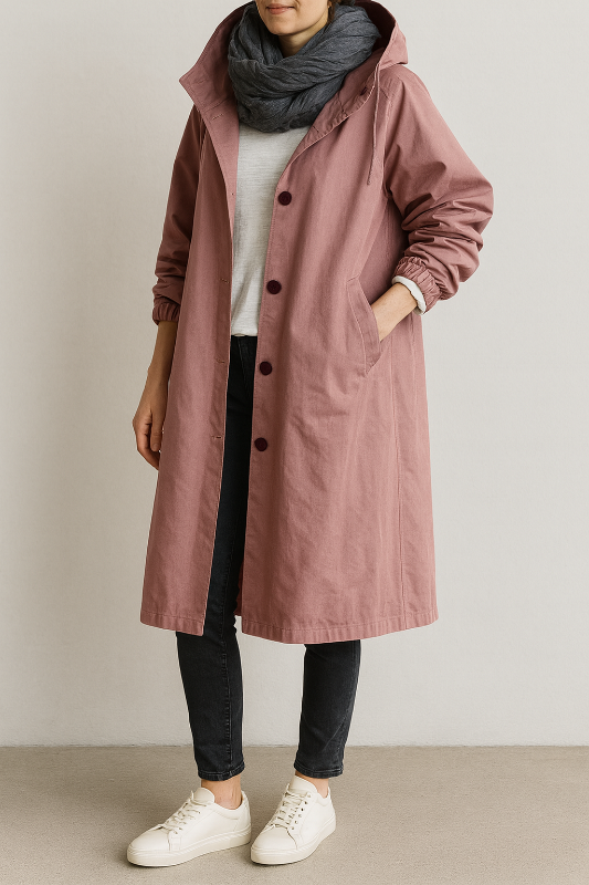 Dieser lange Damenmantel präsentiert ein modernes Oversize-Design aus schützendem Material. Eine verstellbare Kapuze und elastische Manschetten unterstreichen den funktionalen Charakter. Seitentaschen und Knopfverschluss runden das klare Erscheinungsbild ab und machen ihn ideal für regnerische Tage.
